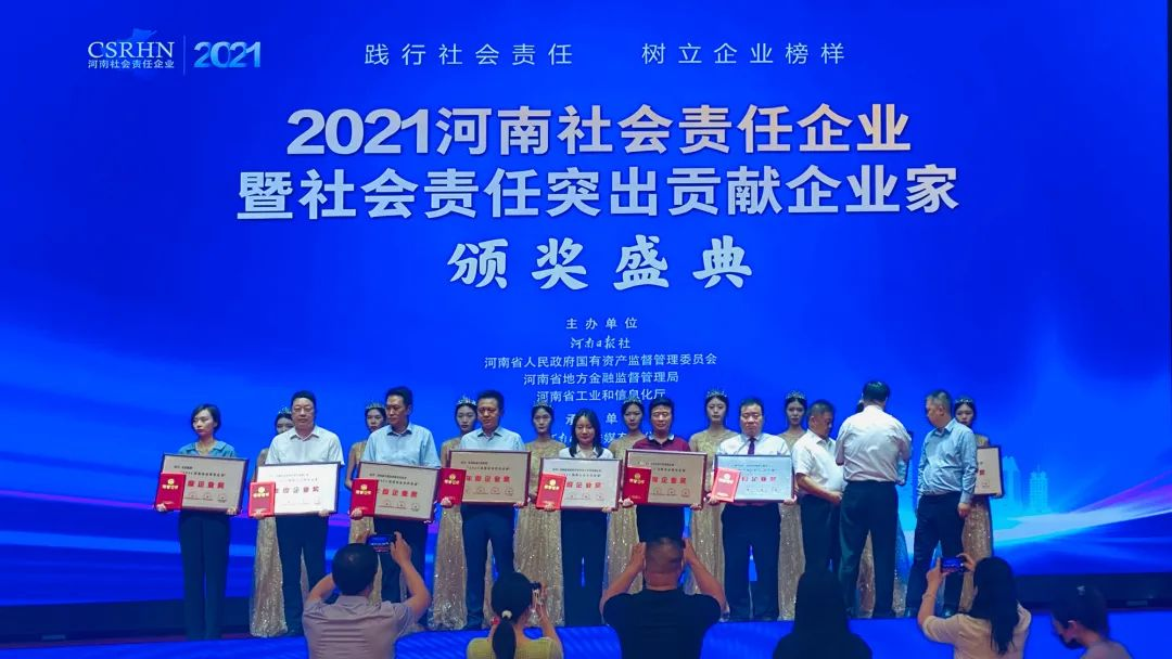 首頁 > 新聞中心 > 公司新聞2022年7月2日下午,由河南日報社、河南省人民政府國有資產監督管理委員會、河南省地方金融監督管理局、河南省工業和信息化廳聯合主辦的“2021河南社會責任企業及社會責任突出貢獻企業家”推選活動頒獎典禮在鄭州黃河迎賓館迎賓會堂舉行。