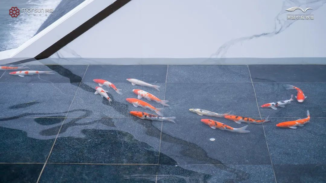 最吸引人的,莫不過園區大堂正對著超大的跌水,碧波蕩漾的漣漪里,倒映著建筑的曲線,錦鯉在水中肆意遨游,靜坐在水景邊的廊架下,可以想象未來的愜意生活。