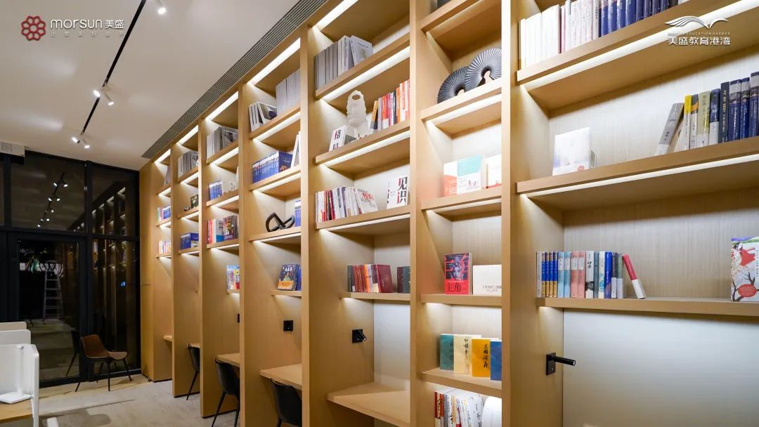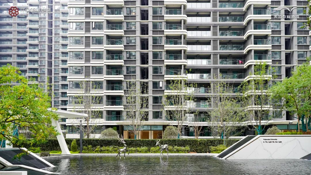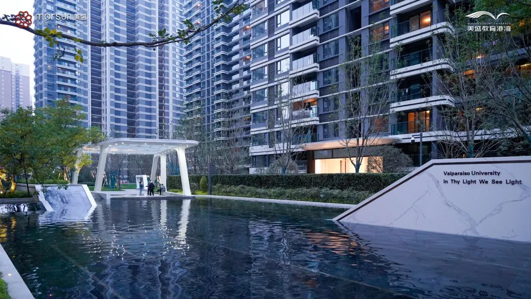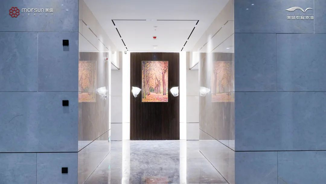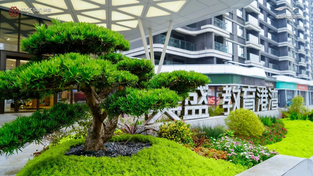 美盛教育港灣一期主入口(南入口)三株層次分明的羅漢松,給業主一種高尚品質的共鳴、賓至如歸的體驗,使業主和到訪賓客感受家庭溫馨。進入歸家大堂,映入眼簾的藝術裝置,向每位家人詮釋著此間的不凡。