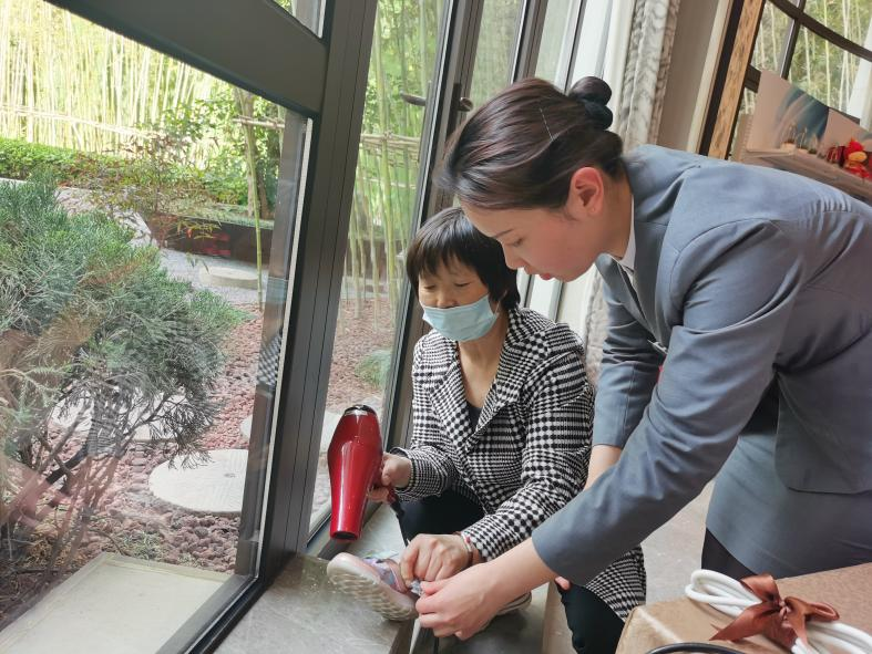 見(jiàn)此情景,項(xiàng)目客服人員來(lái)不及多想,穿著高跟鞋就直接踩進(jìn)水里,抱起孩子,順利把孩子交給奶奶后,客服不放心,擔(dān)心鞋子濕了會(huì)影響孩子的健康,去二樓拿吹風(fēng)機(jī)把孩子濕透的鞋襪吹干了,奶奶感激的說(shuō)到:“小孩子太調(diào)皮了,謝謝,謝謝你們!”“您客氣了,這是我們應(yīng)該做的”客服微笑著回答。