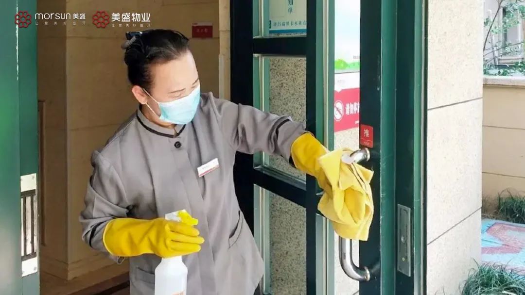 同時(shí),在電梯廳等高接觸場(chǎng)所,物業(yè)工作人員反復(fù)擦拭消毒,不放過(guò)任何一個(gè)按鍵、一個(gè)把手,一個(gè)邊角,锃亮的環(huán)境讓病毒無(wú)處藏身。